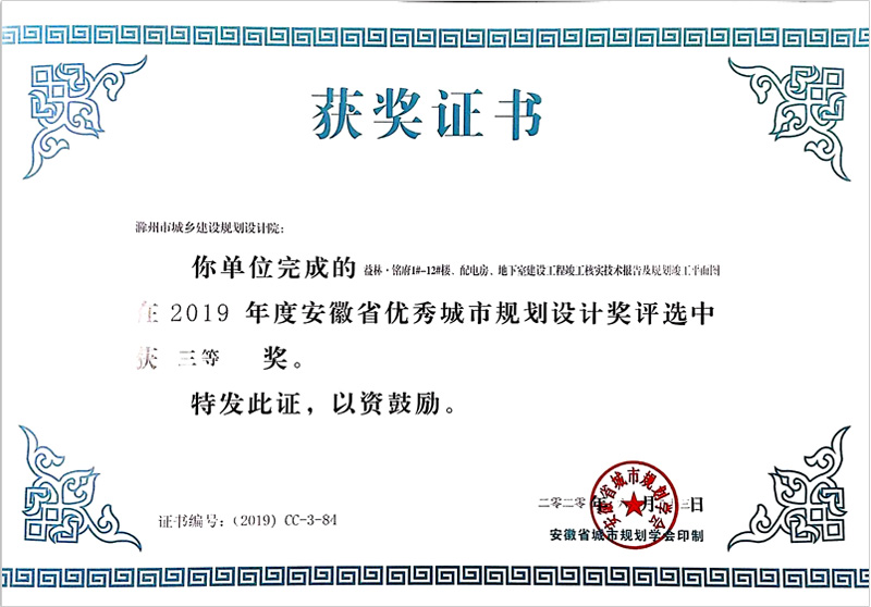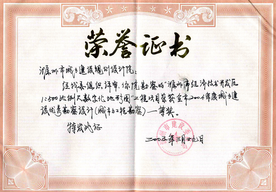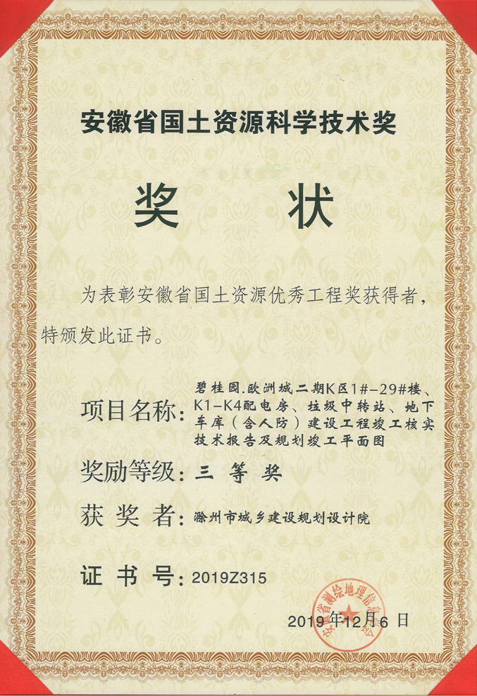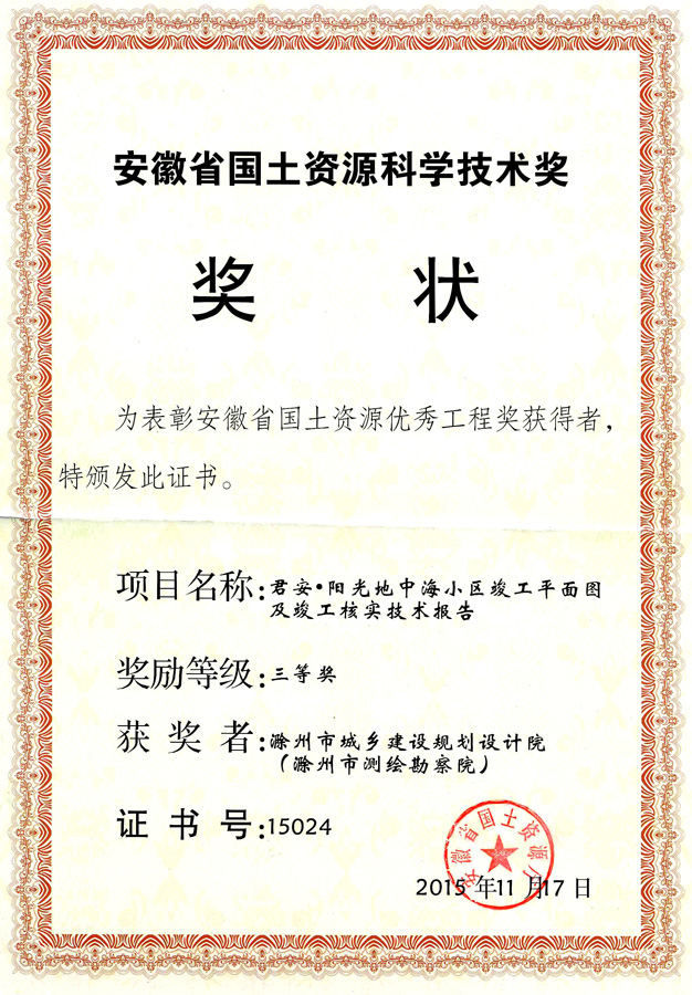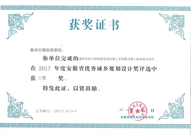 滁州市經開區(qū)地形圖測繪規(guī)劃獲獎證書
